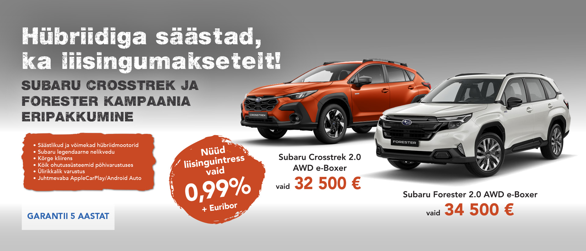 *Subaru Crosstrek Autospirit Liisingu kuumaksed on näitlikud ning ei ole aluseks liisingulepingu sõlmimisel. Liisingu periood 60 kuud, sissemakse 15%, jääkväärtus 35%, liisingu intress 6 kuu euribor + 0.99%. Finantsteenuse pakkuja on Swedbank Liising AS. Vajaduse korral konsulteerige müügikonsultandiga.